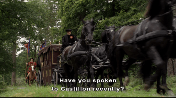 The carriage looks nice, but The Tudors is set in the age of the cart. Actually Historically this, and really any other conversations you see in a vehicle and set prior to 1750, maybe 1910, should be punctuated by frequent and unpredictable bouncing, an air of seasickness and an occasional bump so big it knocks someone’s head right out of the frame, followed by a slightly discombobulated landing. The roads were also more ‘hardened tracks grudgingly maintained’ than roads as we know them.