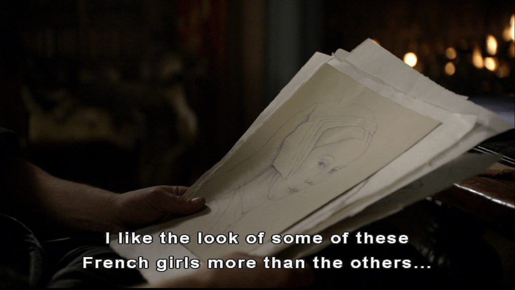 An actual historical incident, here, as Henry summons the French Ambassador, Jonathan Ryans‘ Castillon, for their final scene together to explain why the rules of early modern royal courtship should not apply to him. It would all be so much easier if Francis just assembled eight or so of these women at Calais so Henry could review them.