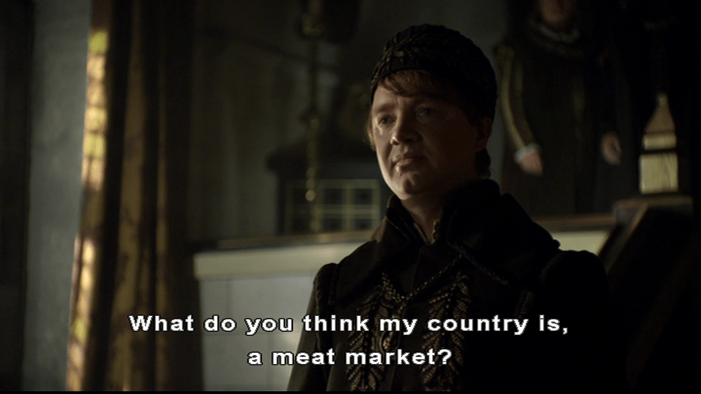 In The Tudors he is a Duke that refuses to get pushed around, and extracts all he can get from England’s sudden interest. Mary’s possible marriage is thrown on the table again (this time for Willliam’s oldest son) as well as an introduction to the Protestant league, but when the conversation turns to meeting his sisters, Duke William proves that the German states are even more reticent about displaying their women for approval than the Empire or France.