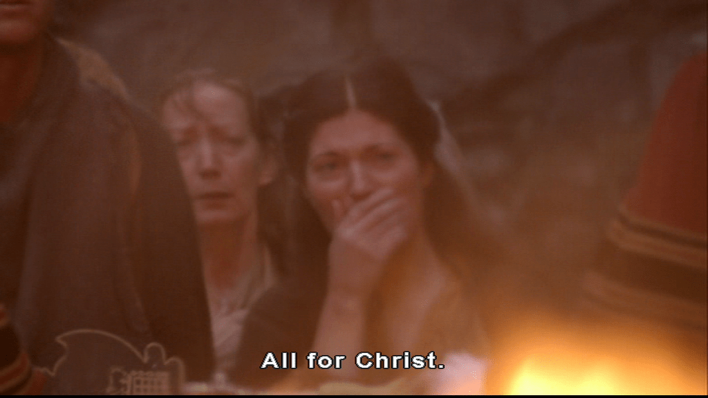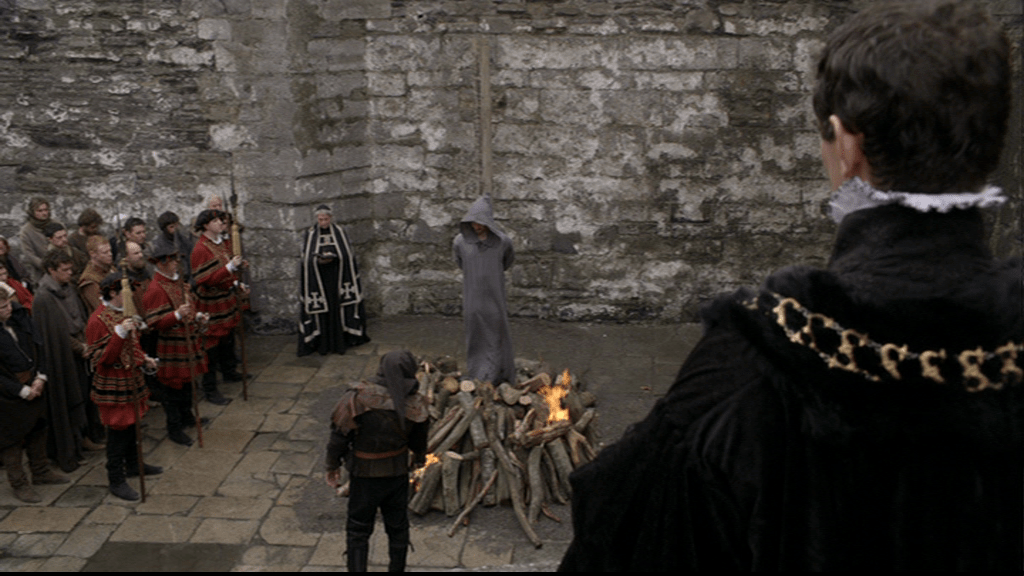 It’s rough. It takes a while. The crowd are sympathetic but Lambert gets burned. His Actual Historical final words are changed from “None but Christ” to “All for Christ”.