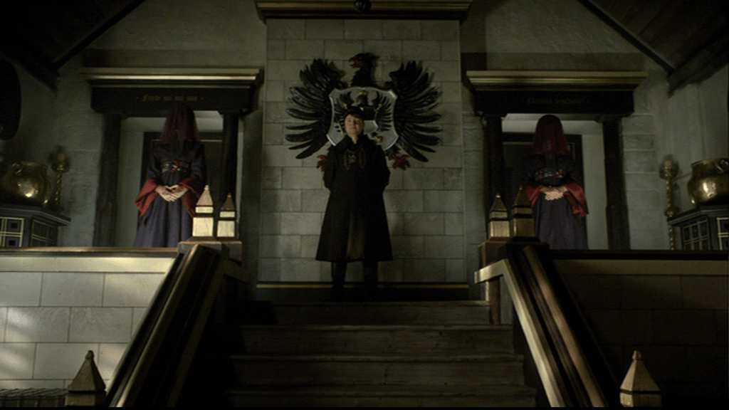Von Sydow Von Waldburg’s first exhortations to Reginald to get back in the fight ring a bit hollow, but Reginald than says that he’s sorry. And that apology, from a young man whose family has just been murdered, knocks Von Sydow Von Waldburg back. He stutters a bit, he’s suddenly a little hesitant, like Cromwell earlier. And then he starts telling this story like he knows it’s going to hurt.