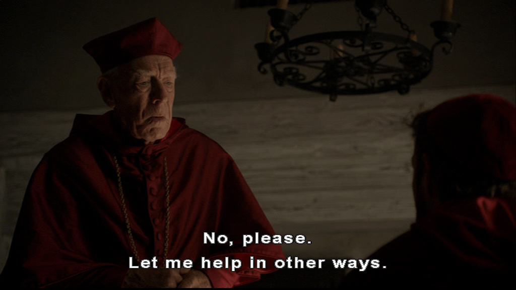 Yeah, I’m not sure they did. Actually Historically he seems to have been a Catholic, and his Actual Historical nickname was “The Vicar of Hell”. It was Cromwell that gave that to him, back in 1536, just after Francis’ faction swap from Boleyn to Seymour (3). Still, the slightly tweaked confession gets Francis and Anne to some ‘sex and the papacy’ joshing which lightens up the mood again. Enough for Francis to try and glean what Edward thinks about Cromwell. Anne maintains she doesn’t know Edward’s opinion on Cromwell but…