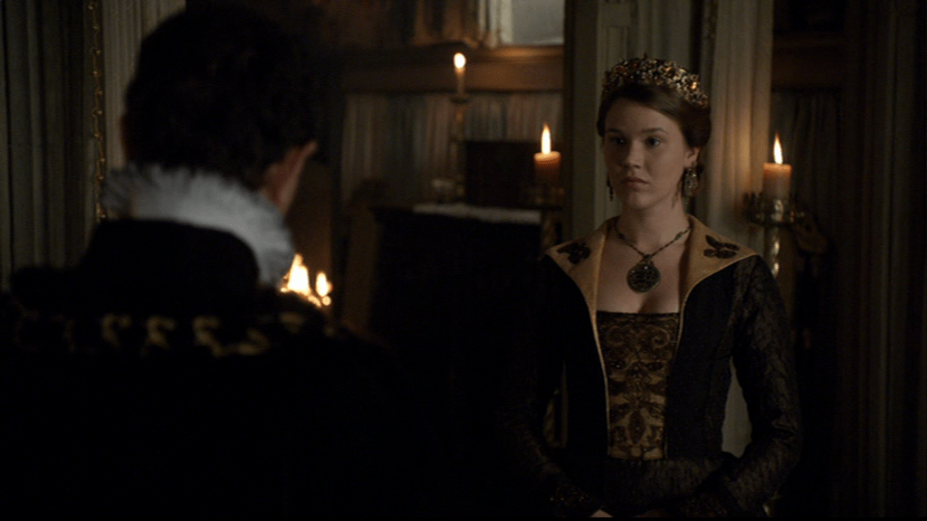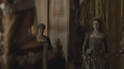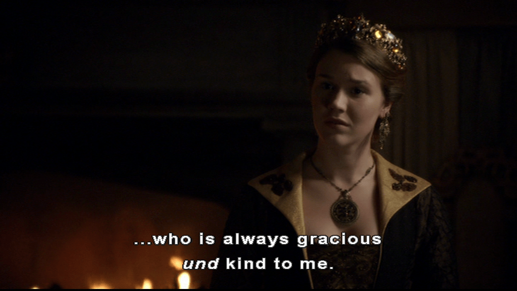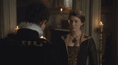 Lady Rutland, Lady Edgecomb, and Lady Rochford (Jane Boleyn) simultaneously dragged the conversation round to babies and wishing that the Queen was pregnant. In there, you’ll find most of the dialogue from this scene, but not in the same order,and Anne wasn’t really volunteering information so much as they were mean girling it out of her (17), like the little monologue about their nightly routine.