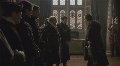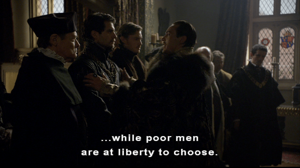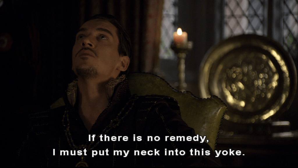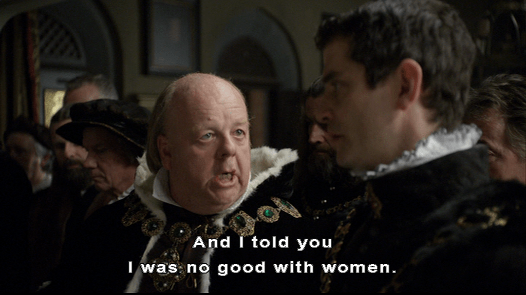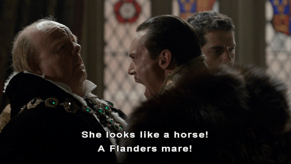 After the disastrous meeting with Anne at Rochester, Henry rushes back to Whitehall and calls what could be generously referred to as a crisis meeting, and what could ungenerously be referred to as mandatory attendance at a performative bitching session. He starts with the lesson that poor men are better off than princes when they get married because princes have to marry what is brought to them (Yeah, he third person neuters his potential wives)…