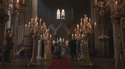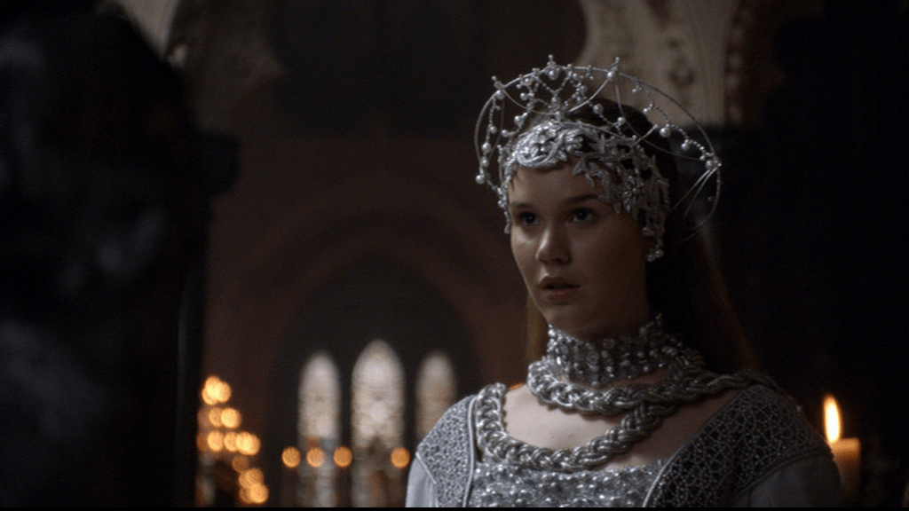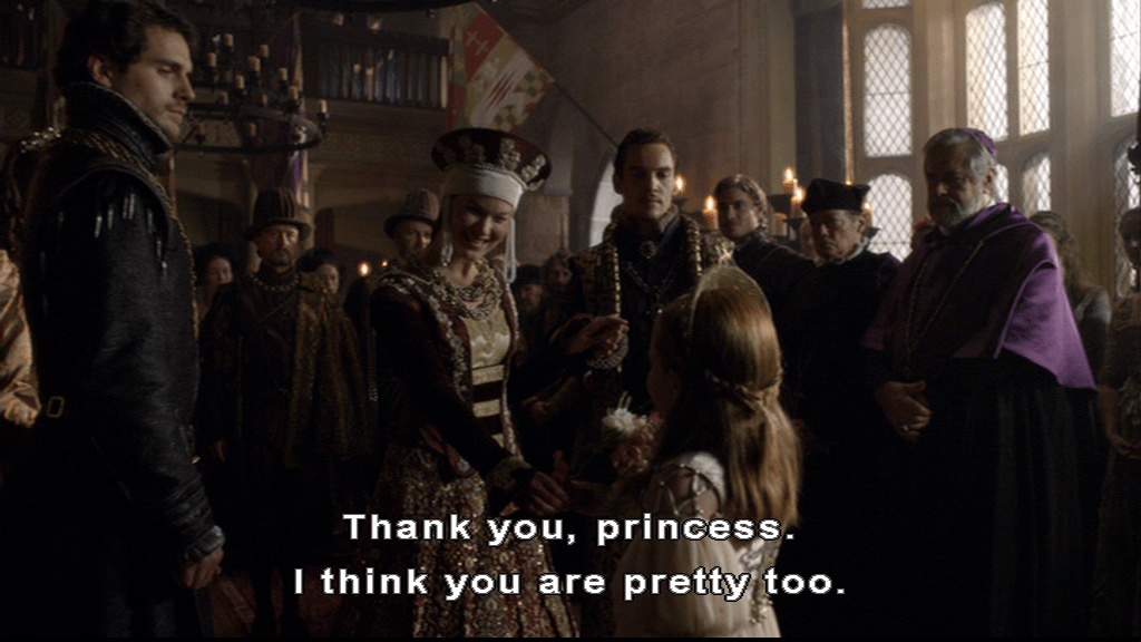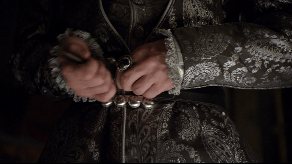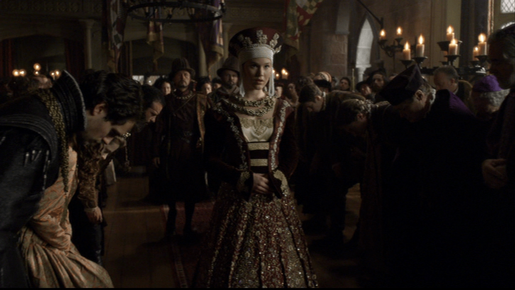 Anne looks pretty good. The head arrangement is very questionable, and I don’t know how to feel about the little panel/ jointed skirt, but Anne of Cleves is working the heck out of the modest bodice this season. Apparently the ornamental rope arrangement is a signature for her, but I’m not sure it’s doing the level of work she believes it is. The Tudors includes the historical tidbit that Anne curtsied to Henry three times at the start of their wedding ceremony (9), and the bride and groom have the energy of a guinea pig and a reticulated python on hunger strike being forced to occupy the same small space.