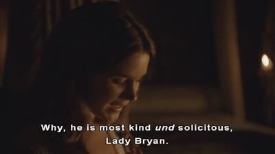In The Tudors, Lady Bryan is the “Tell it like it is, make sure she’s got the basics down” kind of matriarch, and The Tudors adds a physically specific line to the historical dialogue.