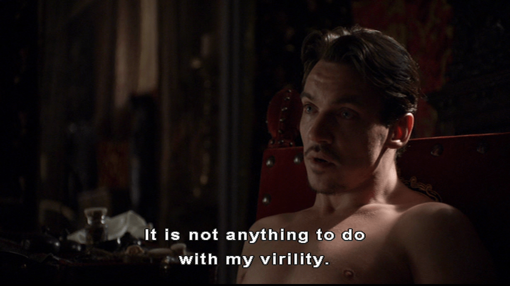 And, hey, the guy has been blaming Anne for this and claiming to detect virginity by breast feel so lets throw in that his claims of wet dreams, such a convenient signifier that he’s still virile, and two in quite a short time frame (almost like you’re underlining it, Your Majesty) are statistically quite improbable for a 48 year old man and therefore suspiciously convenient.