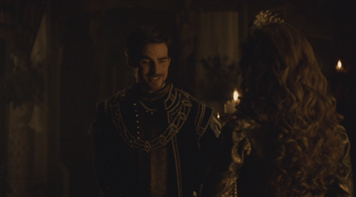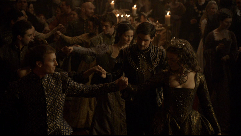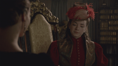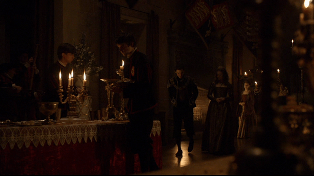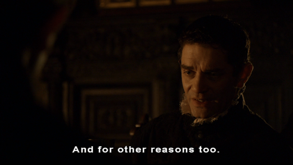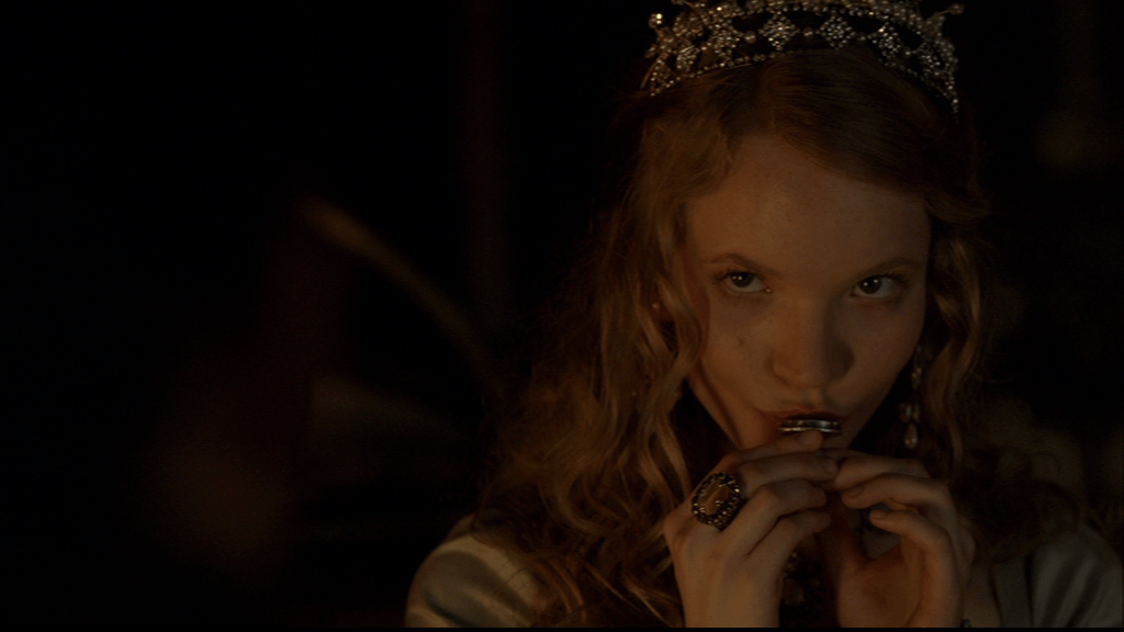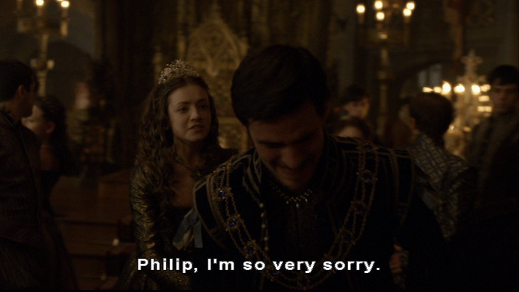 Looking innocent and managing not to rub her hands together as she sets up the most charming courtly love scene in the series. She’s not hiding it quite as well when she steers the conversation with Philip around to Mary with a bright smile.