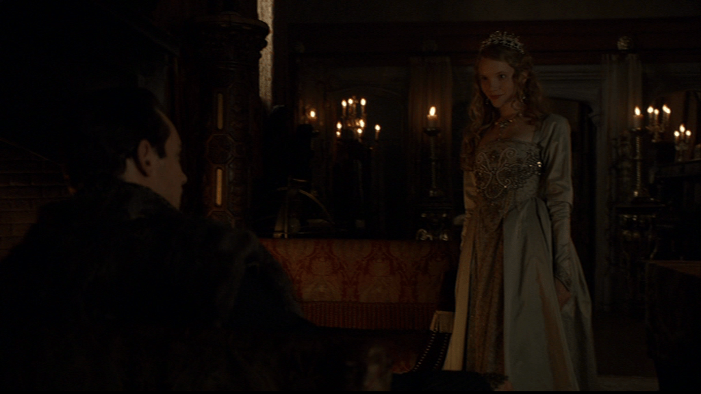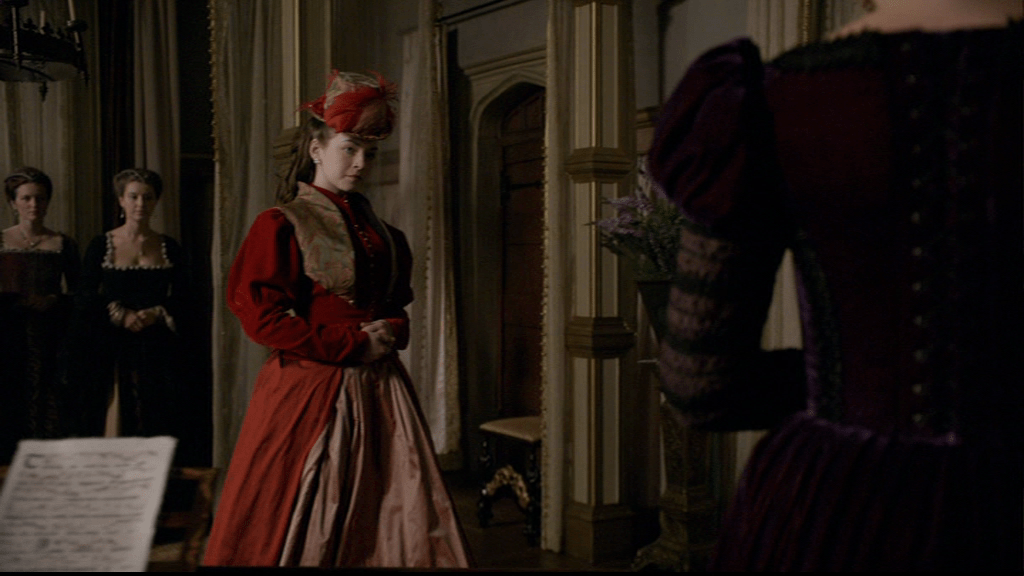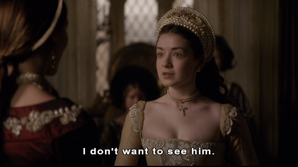 The Tudors‘ Princess Mary seems to respond well to polite formality. There is a tiny temperature rise at Queen Anne’s dignified greeting and respectful request that she sit. Queen Anne has news for her.