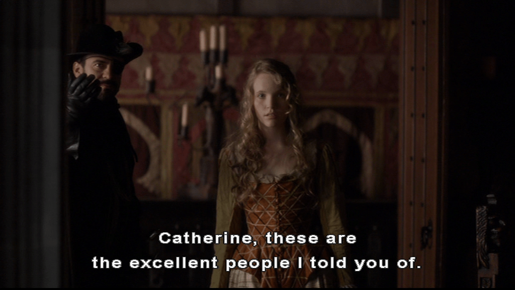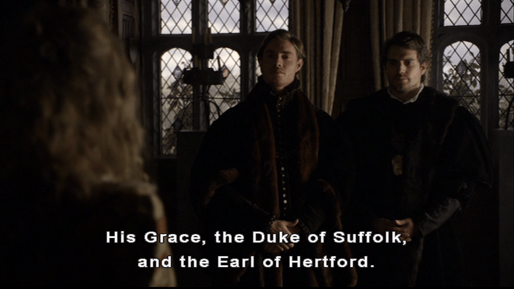 Who are pleased. She’s described as distantly related to the Duke of Norfolk by Sir Francis Bryan when she was, in fact, his niece. Edward Seymour manages to say something facetious about her counting skills when she tells them how old she is (The Tudors puts her at 17). Brandon isn’t here for the humour at her expense, he studies her closely, and engages her in light conversation, before passing judgement.