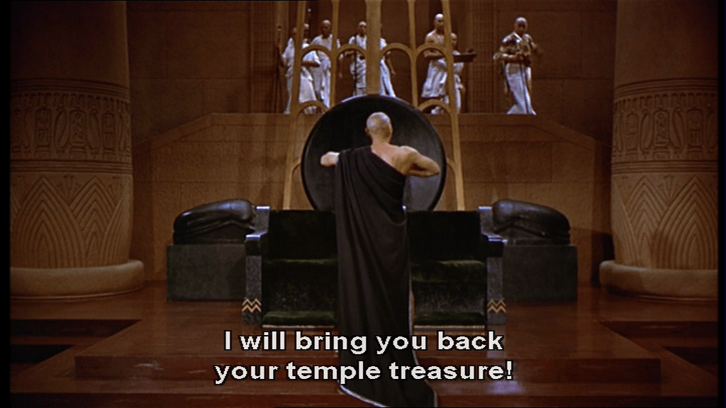 Throughout this scene, Nefretiri is always adding to whatever Rameses says he’s going to do. He says he’s going to kill Moses, she says “Kill him with your own hands”. Then just when Rameses has got his War Crown on,