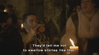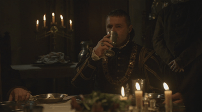 The guy in the cloak who sneaks in behind him will turn out to be a spy for Gardiner, or one of Gardiner’s allies. Surrey sits down with two of his men, who he apparently decided to meet here, and calls for ale. The ‘wench’ that delivers his ale is a larger carriage kind of girl, and busy about her business when he asks her if she’d like to suck the cock of a member of the Order of the Garter? What would her friends say to that, eh?