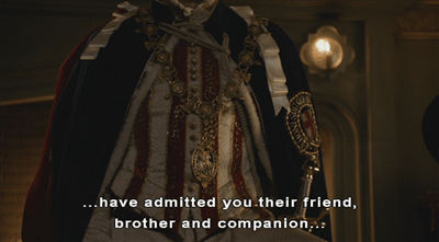 Now Hirst takes a bit of licence here, in order to create drama. Surrey and Seymour were two of the four inductees to the order in 1541, and there would just be the one ceremony a year so they joined at the same time. In The Tudors Seymour is positioned as having taken his place in the order a few months beforehand.