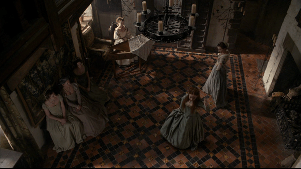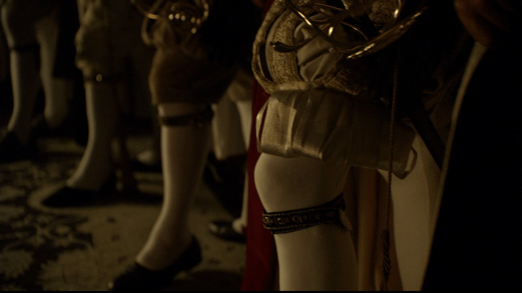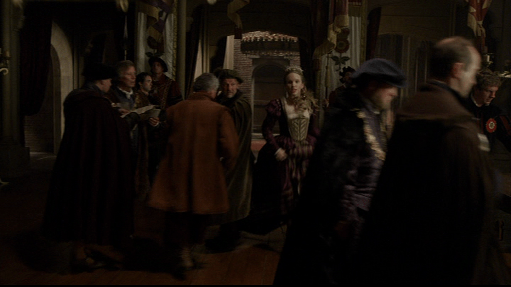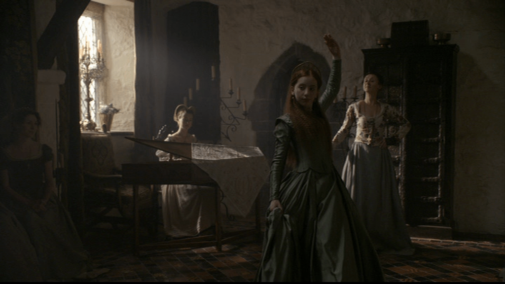 It’s all a lot more dignified and composed than Katherine’s earlier dance lesson. Here Elizabeth is under the watchful eye of the dance mistress and the appreciative eyes of Anne of Cleves and the attendant ladies, who include Kat Ashley, centre of the group of three on the left.