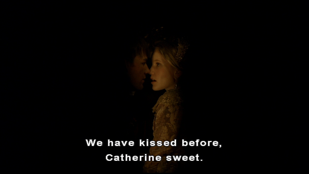 Seen mostly through Lady Rochford’s avid eye, we watch Culpeper and Katherine meeting and making out. He asks her if she likes meeting like this and yes she does, He asks if she loves him yet and wants her to let him know that by some ‘token’. She says “Shall I kiss you?” and he gets the first bit of edge in his voice as he says