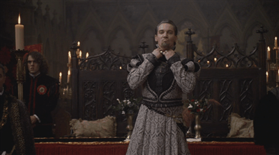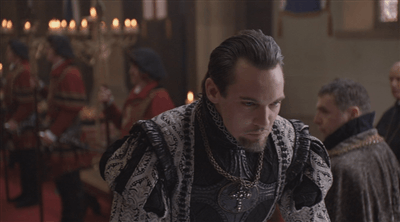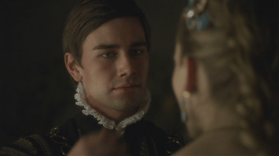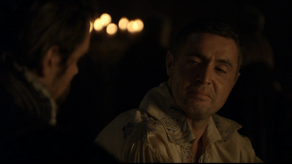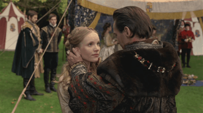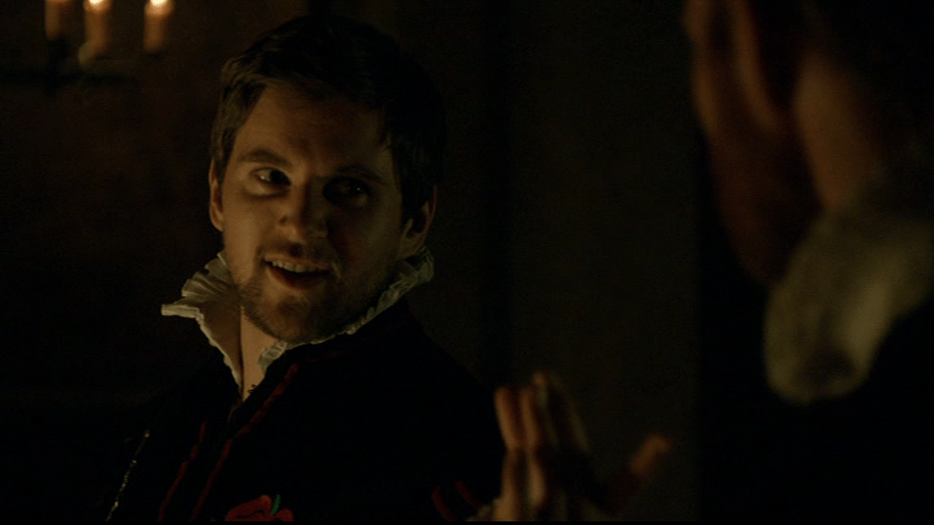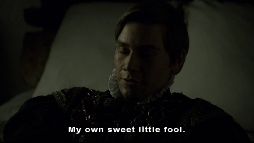 Francis is hammered. Manox wasn’t Scottish but his surname was, and in The Tudors Francis remembers him as being Scottish. We see his return to his bulldozer seduction technique by just wandering over to Katherine and deciding to stroke her face.