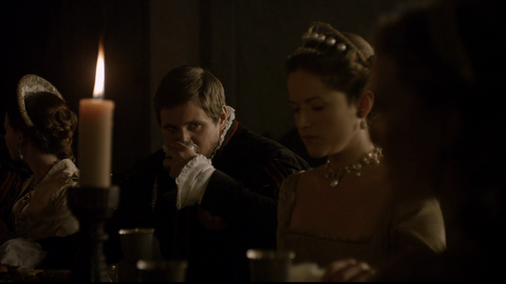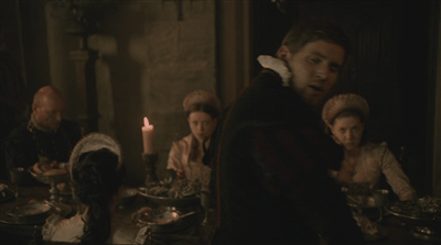 Francis’ manners were boorish, and his appointment caused apprehension and suspicion in the Queen’s household (9). As frustrating a character as he is, I like the spin The Tudors puts on him. We see Katherine, engaged in almost pointedly refined and polite conversation at the head of the table.