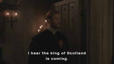 A messenger rides in full tilt into the courtyard and rushes in, covered in mud to deliver the news that not only is James not coming, but there have been attacks over the border. There were attacks which escalated, on both sides into 1542 (Particularly after Henry’s sister Margaret, James’ mother, died on the 18th October 1541) but here it’s shown as a sudden thing at the end of September. Henry reacts to the news in a very Henry way.