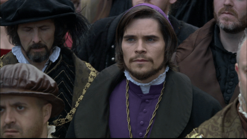 The Tudors goes in on the tension between Katherine’s current and ex being suddenly in the same household, which works dramatically but doesn’t have an actual historical basis (maybe there was, but once they thought Katherine had been committing adultery no one really cared what her two men thought of each other), and the rest of this scene muddles its characters, contains some really offensive dialogue and drifts further from actual history.
