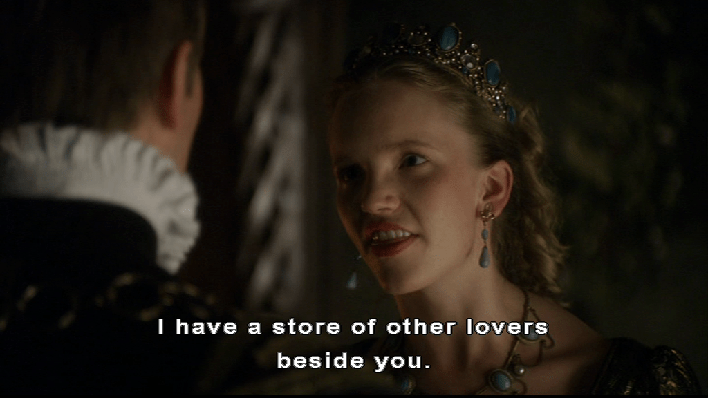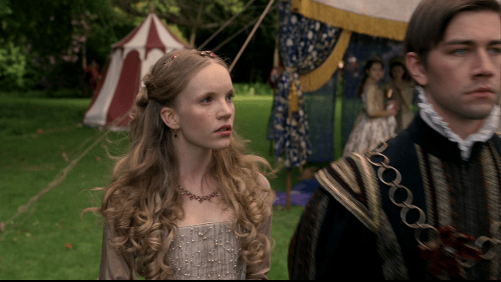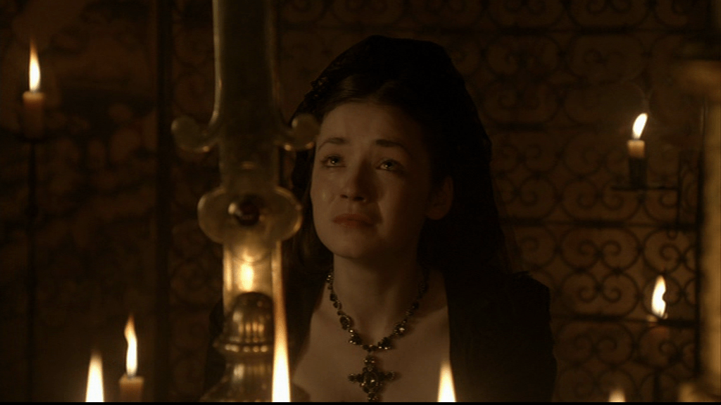 Certainly by the time they got to this point, she wasn’t claiming maidenly modesty. She was a married woman with a history and he knew it. So both of the character’s attitudes here don’t square with actual history, and at some points, even with their history as shown on The Tudors.