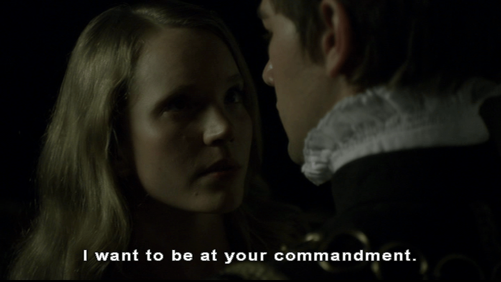 For his part it would be nice if he didn’t turn every conversation to whether she’s pregnant yet, and for her part her claim to be at his command, always, would feel a bit more sincere if she weren’t looking after Culpeper desperately about 10 seconds after saying it.