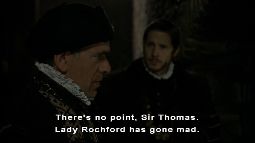At the end of the scene Lady Rochford runs across the room to ask the leaving Thomas Seymour a pretty obvious question that in its intensity foreshadows the next turn of her story.